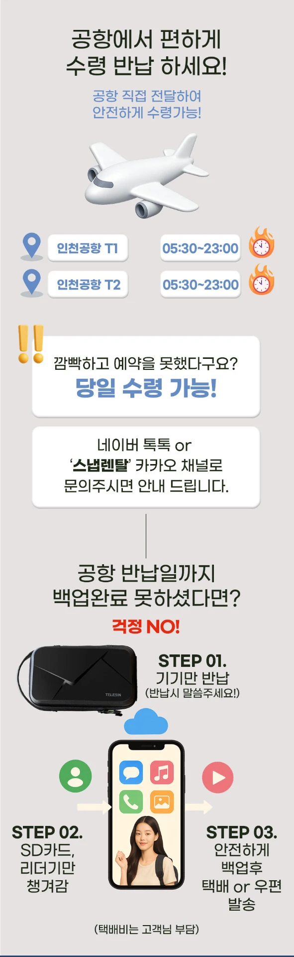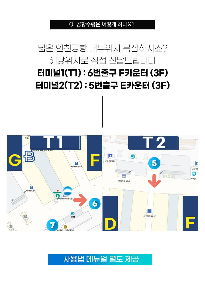 For both pickup and return at Incheon Airport Terminal 1, please come to Exit 6 on the 3rd floor (near Counter F) and we will deliver it to you in person. For both pickup and return at Incheon Airport Terminal 2, please come to Exit 5 on the 3rd floor (near Counter E) and we will deliver it to you in person.