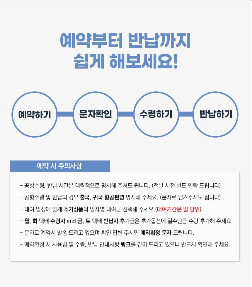 仁川空港1ターミナル受領、返却とも3階6番出口(Fカウンター付近)お越しの上、ご連絡いただければ直接お届けします。 仁川空港2ターミナル受領、返却とも3階5番出口(Eカウンター付近)お越しの上、ご連絡いただければ直接お届けします。